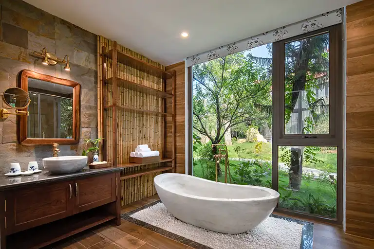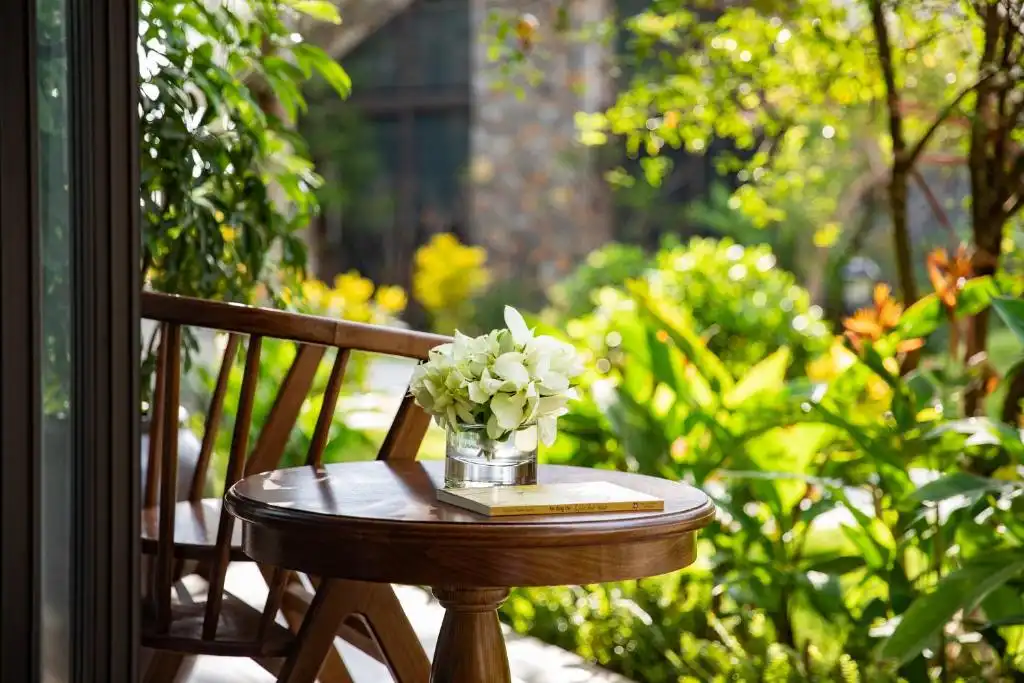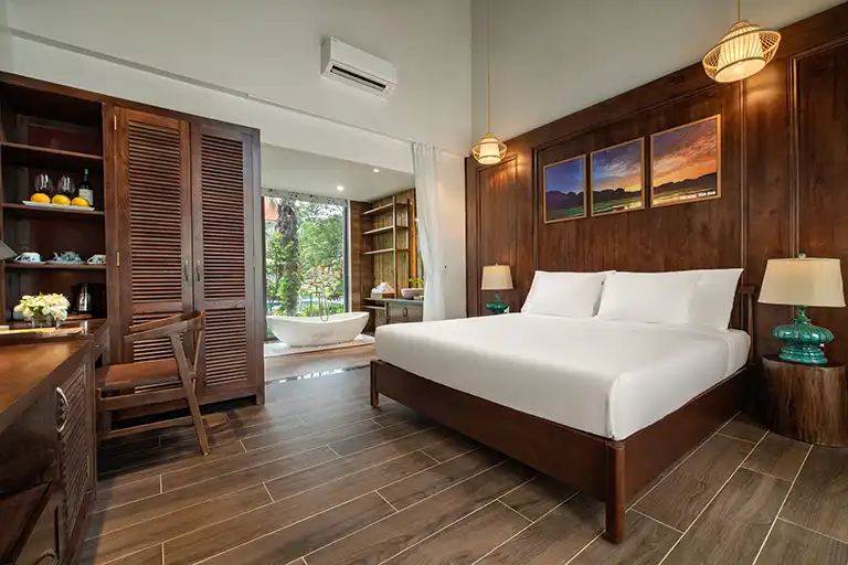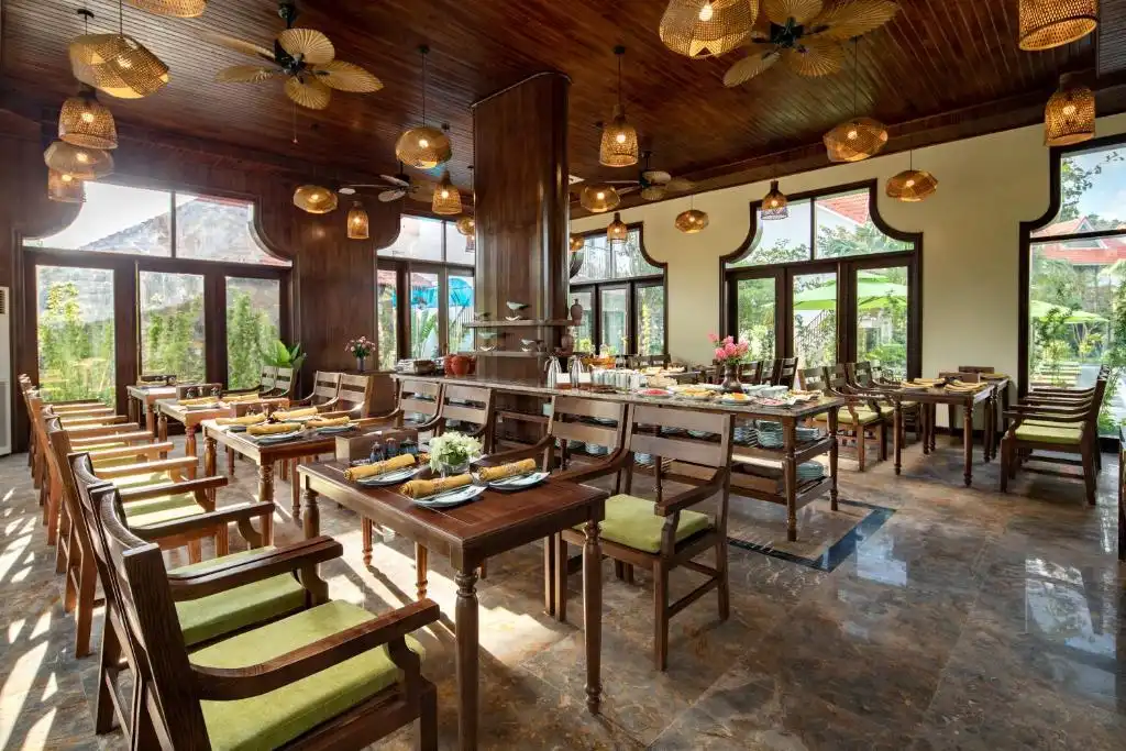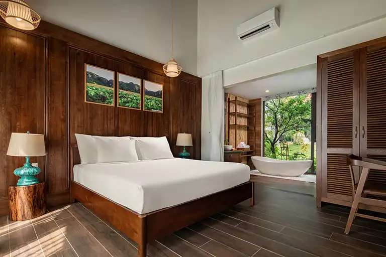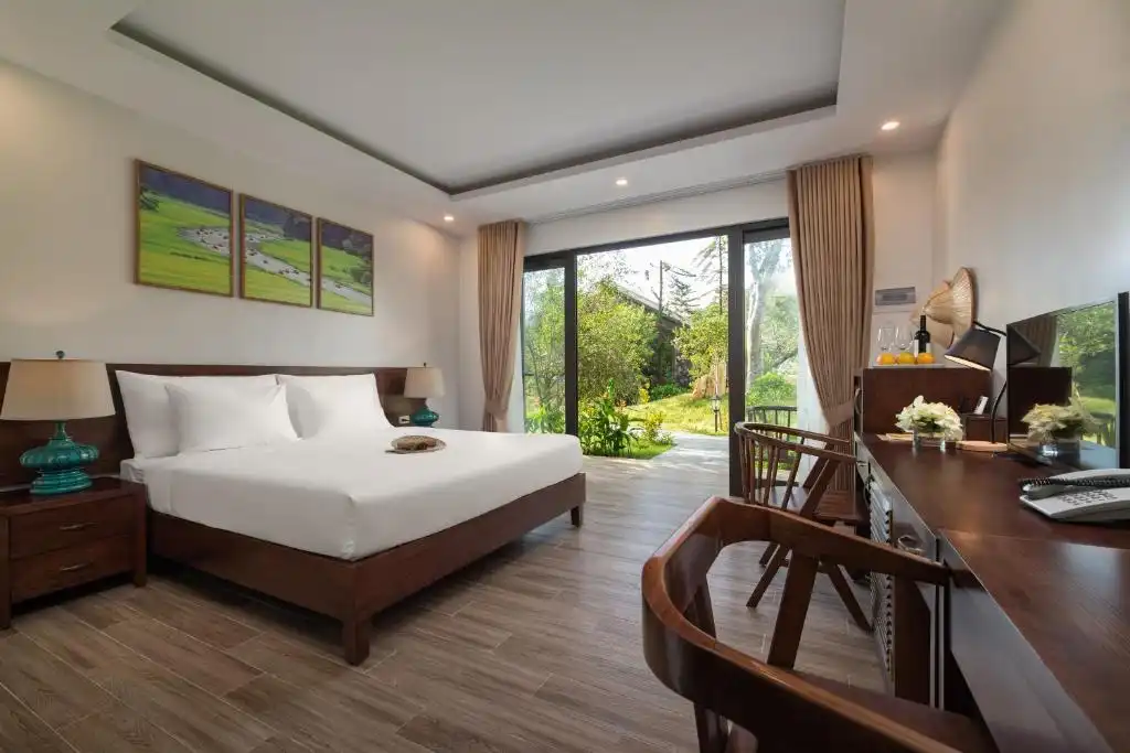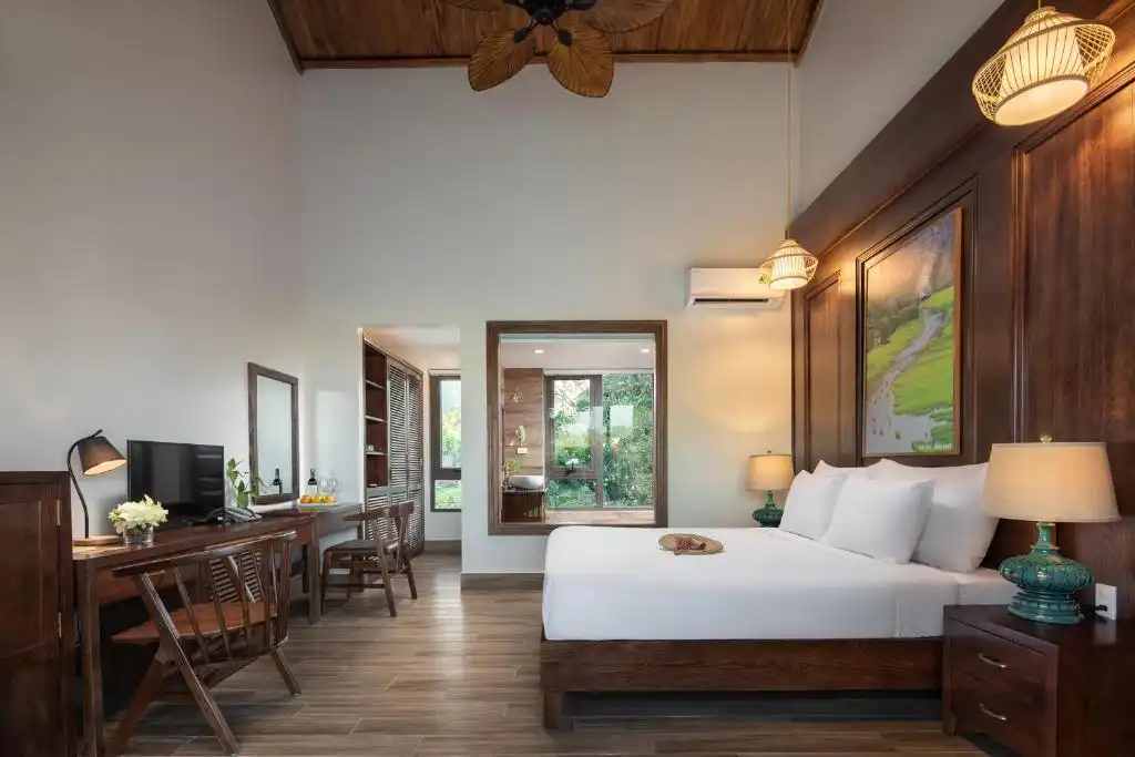 Resort nổi bật với những biệt thự riêng biệt nằm xen giữa những thảm cây. Không gian êm đềm ven nhánh sông Hoàng Long thơ mộng mang đến một không gian yên tĩnh giúp bạn thả mình hoàn toàn vào thiên nhiên, tạo nên kỳ nghỉ vô cùng thư thái.