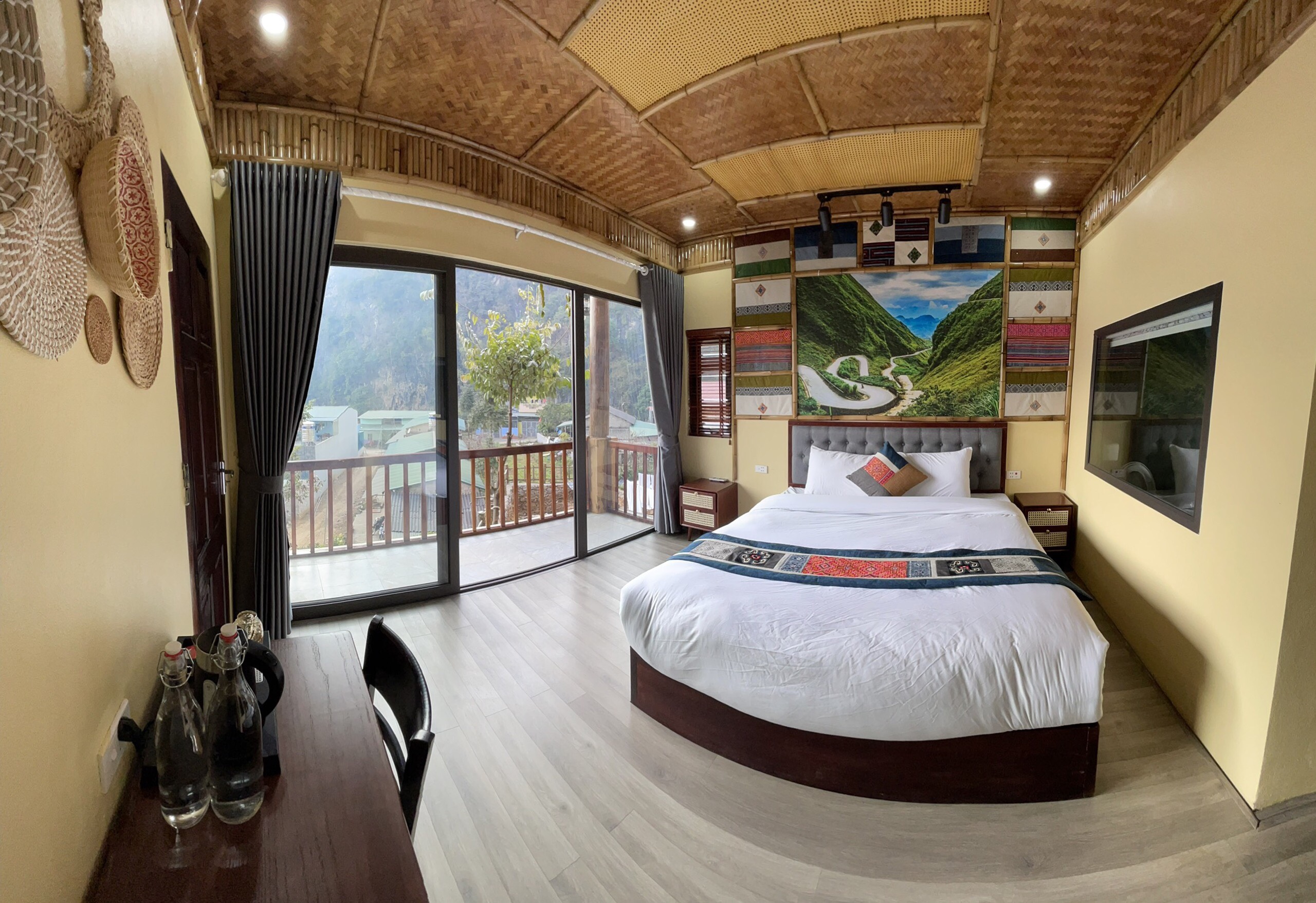 Dong Van CliffSide House nằm ngay dưới chân khu di tích lịch sử Đồn Cao, chỉ cách trung tâm thị trấn Đồng Văn khoảng 1,8 km, là điểm dừng chân lý tưởng để du khách chiêm ngưỡng toàn cảnh cao nguyên đá hùng vĩ và thơ mộng. Khuôn viên House được decor tỉ mỉ với lối đi rải đá, sân lát gạch đỏ, hồ nước xanh biếc cùng những góc ngồi xinh xắn, nơi du khách có thể thưởng trà chiều, hít thở bầu không khí trong lành và ngắm cảnh núi rừng tuyệt đẹp. Lưng nhà tựa vào núi, phía trước là cánh đồng bao la và thung lũng mênh mông, tạo nên không gian bình yên với tầm nhìn “cực chill”.
