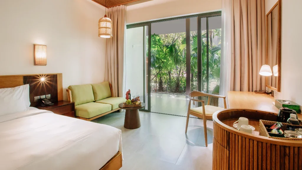 Nhà hàng Palm Kitchen: Nhà hàng được thiết kế với gam màu ấm cùng họa tiết xanh và vàng nổi bật phục vụ thực đơn tự chọn & gọi món với các hương vị Việt, Thái và phương Tây. Sức chứa: 120 khách. Thời gian hoạt động: 06:30-22:00. Khách hàng đặt phòng kèm bữa sáng sẽ thưởng thức bữa sáng tại nhà hàng này. Thời gian phục vụ bữa sáng: 06:30-10:00.