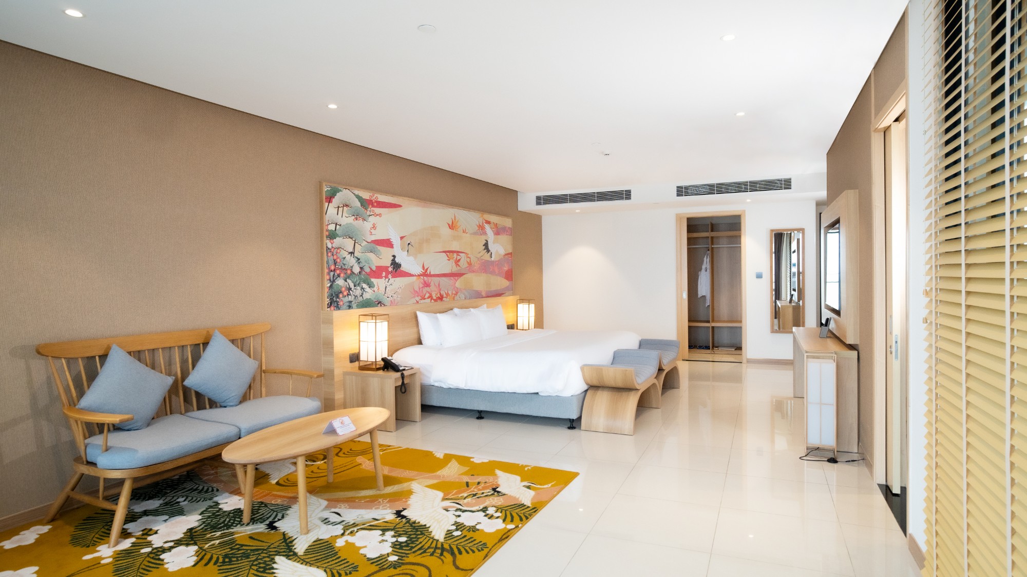 Mikazuki Japanese Resorts Da Nang sở hữu khu villa 12 căn với 48 phòng hướng vườn và khu khách sạn cao 22 tầng với 294 phòng, đặc biệt tất cả phòng ở khu khách sạn đều 100% hướng biển và có bồn tắm lộ thiên. Mỗi phòng đều được trang bị đầy đủ các tiện nghi cơ bản như máy điều hòa, tủ lạnh, tủ quần áo, bàn làm việc, wifi, truyền hình cáp/ vệ tinh, két sắt. Phòng tắm riêng đi kèm tiện nghi vòi sen, máy sấy tóc và đồ vệ sinh cá nhân miễn phí.