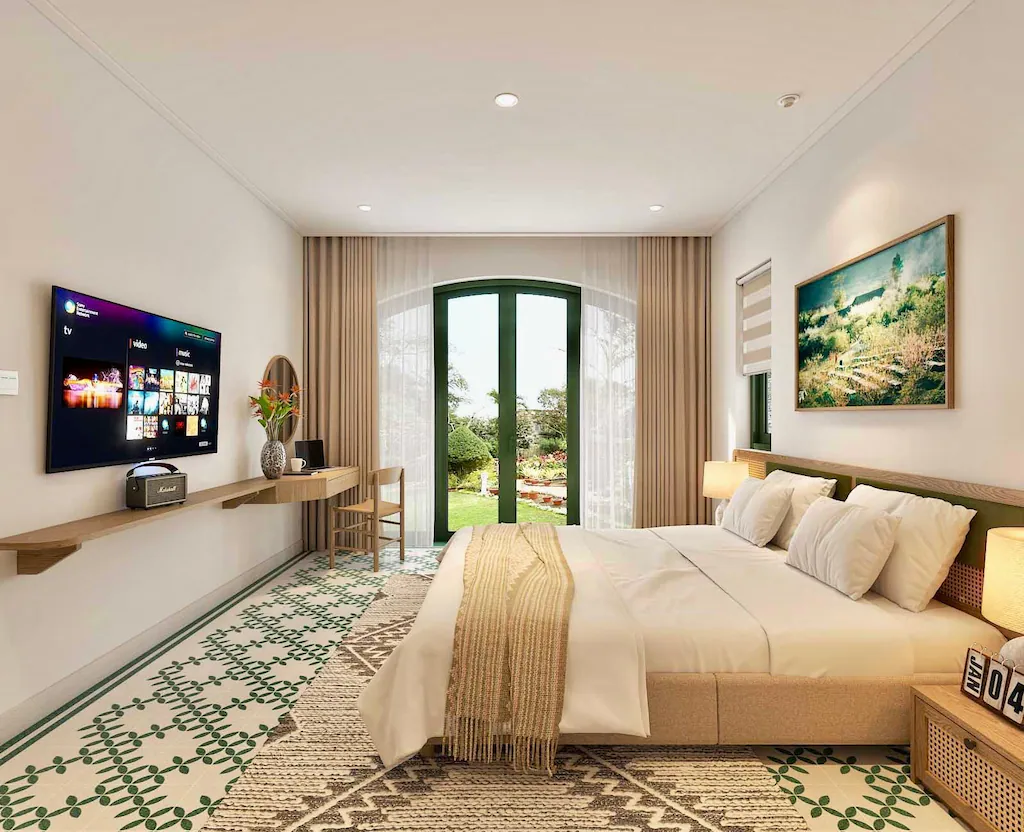 Khung cửa cong mở ra khu vườn xanh trước phòng—một điểm nhấn rất “Mộc Châu”: nhẹ nhàng, trong trẻo, đủ sức làm dịu cả một tâm trí mệt mỏi. Chỉ cần kéo nhẹ rèm, mây và gió như ùa vào cùng ánh sáng.