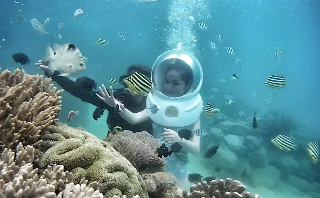 Tàu du lịch sẽ đưa Quý khách ra bãi san hô để tham quan và khám phá nét độc đáo về hệ sinh thái biển. Tại đây quý khách có thể bơi và chiêm ngưỡng vẻ đẹp của các rạn san hô cùng nhiều loại cá đủ màu sắc sặc sỡ dưới lòng đại dương, trực tiếp khám phá thế giới biển với gần 80 loài san hô và các loài sinh vật biển đa dạng quý hiếm bằng kính lặn truyền thống của ngư dân (hoặc kính bơi). Ngoài ra, Quý khách có thể tham gia các trò chơi như: Motor nước, phao chuối… (chi phí tự túc)