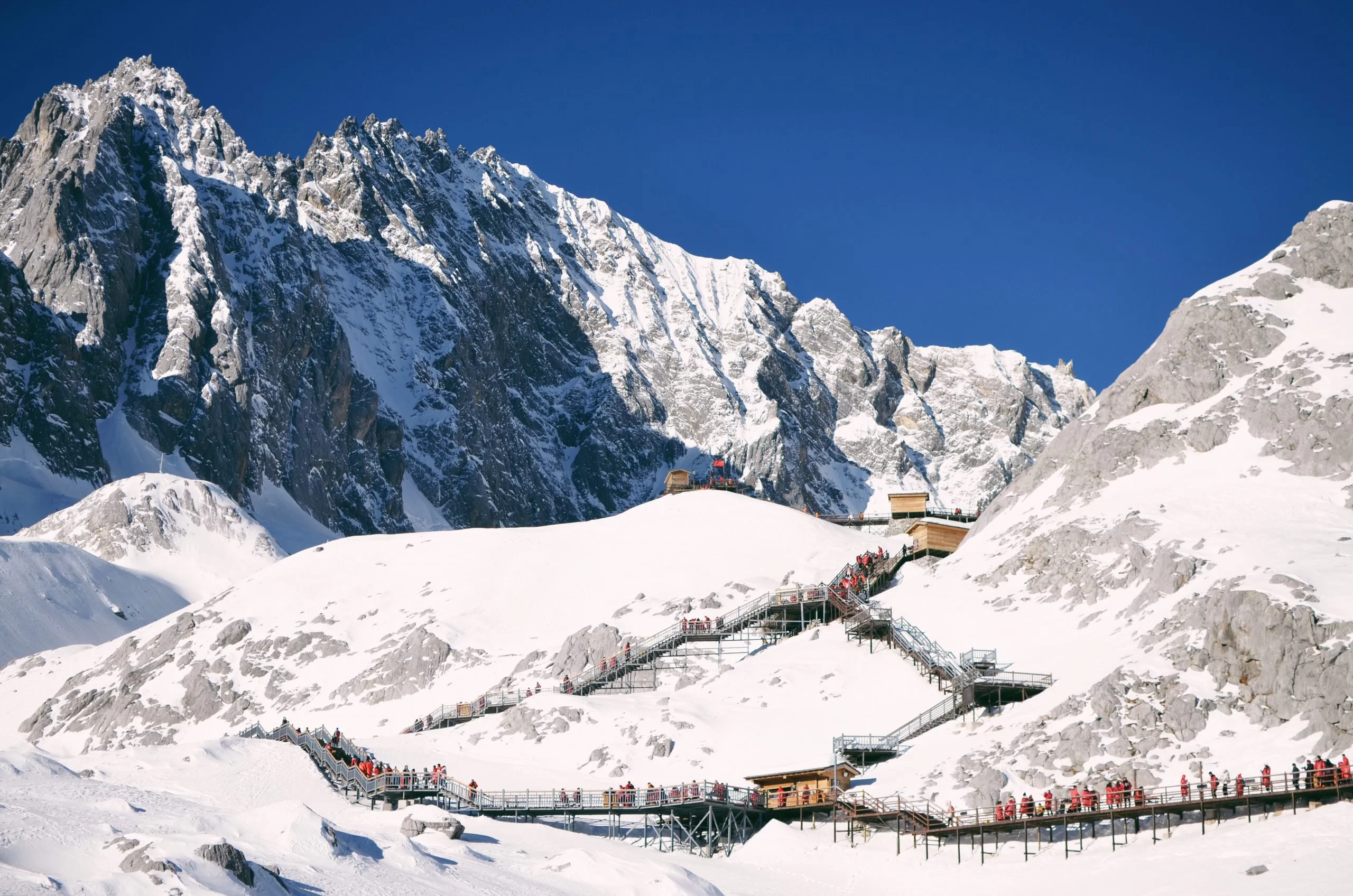 • Núi Tuyết Ngọc Long cách trung tâm phố cổ Lệ Giang về phía Bắc, quanh năm tuyết phủ trắng bao phủ một khu vực rộng lớn giống như con rồng lớn nên được gọi là “Ngọc Long”. Nơi đây còn được so sánh với “Thụy Sĩ Á Đông” như rặng Pyrenes (ngọn núi nổi tiếng tại biên giới Pháp và Thụy Sỹ). Đoàn đi cáp treo lớn lên núi với độ cao 4600m và chụp ảnh lưu niệm.
