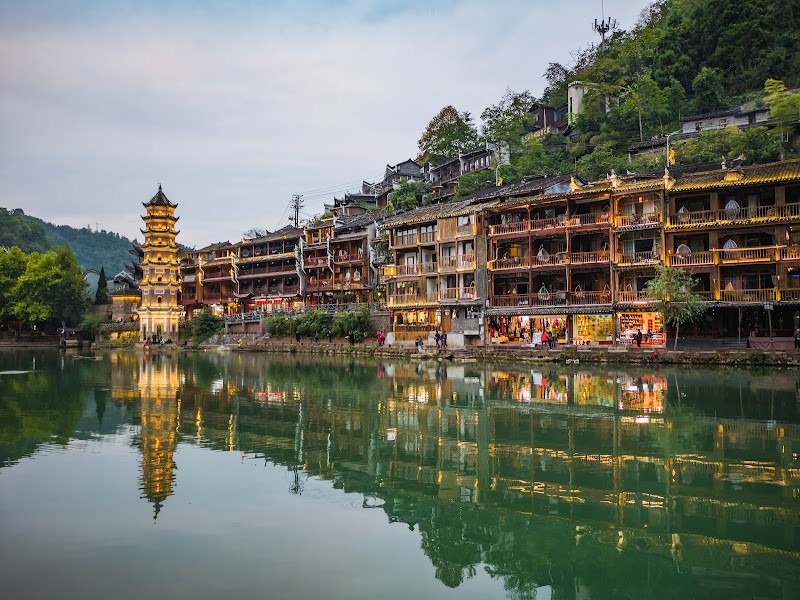 Đoàn khởi hành đi Phượng Hoàng Cổ trấn tham quan: Phượng Hoàng Cổ Trấn : Tháp Vạn Danh, khu cảnh điểm Sa Loan, cầu Đá Nhảy, Phố cổ lát đá tấm,……Có rất nhiều cây cầu bằng gỗ, bằng đá nối hai bờ sông Đà Giang, đặc biệt là cầu Hồng Kiều duyên dáng với kiến trúc độc đáo theo phong cách rất “Phượng Hoàng”. Đứng từ bên đây cầu nhìn sang phía bên kia cầu, bạn sẽ thấy thấp thoáng Phượng Hoàng cổ trấn trải dài với những ngõ sâu hun hút, những ngôi nhà rêu phong với mái ngói cổ âm dương dày đặc, màu xám như đá tai mèo. Những tượng phù điêu trên đầu mái cong vút một cách đầy kiêu hãnh. Đoàn ăn trưa sau đó quý khách tự do khám phá Phượng Hoàng cổ trấn. Quý khách ghi lại những bức hình đẹp nhất tại cổ trấn 1300 năm hình thành và phát triển, khám phá một bảo tàng sống về văn hóa của các dân tộc; cũng như ngắm nhìn những thành quách, những dãy phố, những căn nhà cổ, gia trang, văn miếu, đền chùa đậm dấu ấn của người Trung Quốc. Đây cũng là nơi nét đẹp của văn hóa dân tộc Trung Hoa chảy qua và để lại những giá trị truyền thống đẹp đẽ nhất. Hơn cả, Phượng Hoàng Cổ Trấn còn hút hồn du khách ngay từ ánh nhìn đầu tiên đến khi rời bước bởi cảnh sắc hoa lệ, đẹp như một bức tranh thủy mặc.